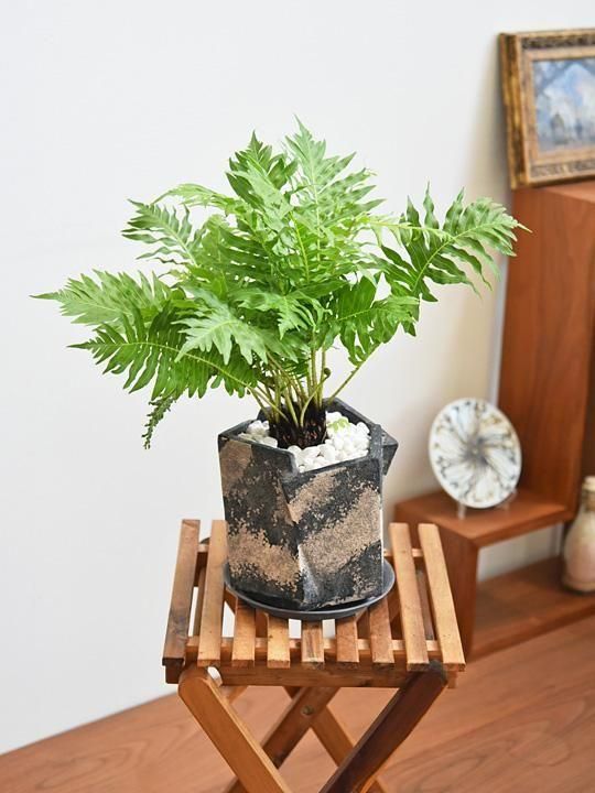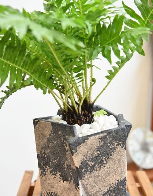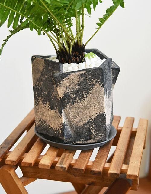 多面体のフォルムと、黒っぽい岩にモルタルをかけたような、粗削りな雰囲気が魅力的な鉢に仕立てました。