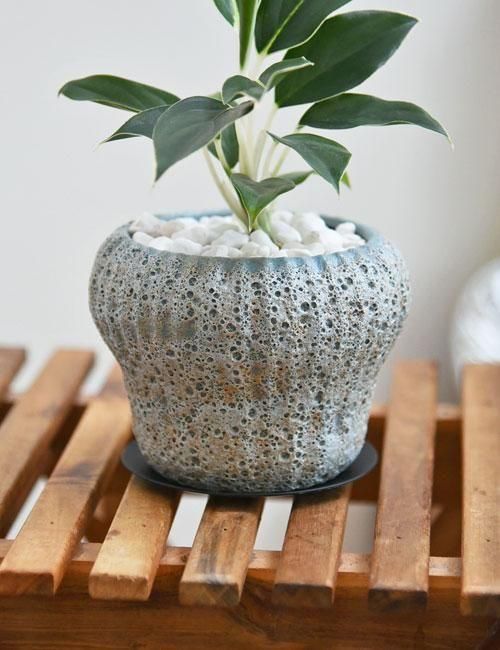 発泡させた釉薬の風合い感と、縦のラインが印象的な鉢に仕立てました。