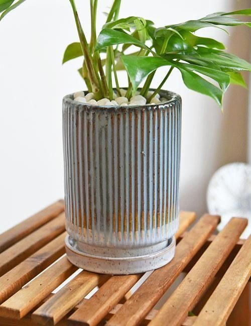 縦に彫り込まれたラインと、ビビッドすぎない抑えたスカイブルーとホワイトのツートンがきれいな鉢に仕立てました。