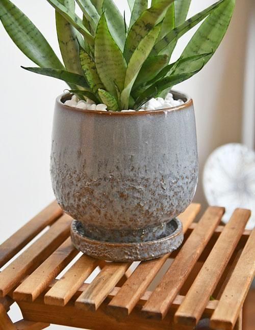 シックなグレーの艶あり釉薬に、気泡感とざらみ感のある半分から下の仕上げが、ステキな雰囲気を醸す鉢に仕立てました。