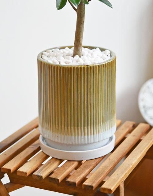境界が混ざり合ったキャラメルブラウンとホワイトの艶あり釉薬のツートンカラーと、縦の彫り込みのラインがステキな雰囲気を醸す鉢に仕立てました。