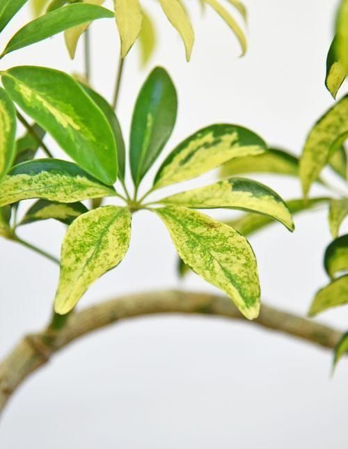 バランスよくたくさんの葉を付けていて、美しい曲り樹形のシェフレラ・アッシュフォリアです。